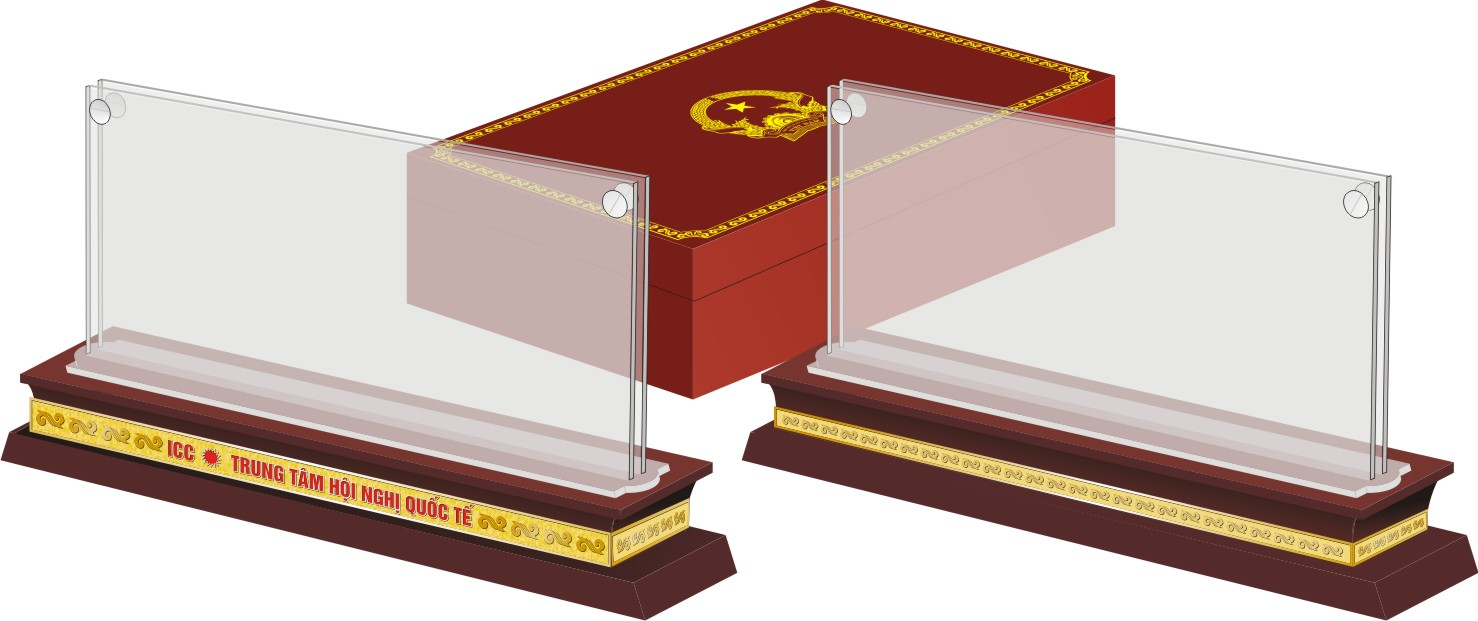 Biển chức danh mica đế gỗ: Một loại khác cũng được làm từ chất liệu mica, tuy nhiên phần đế của biển được làm từ gỗ. Phần đế được thiết kế với kiểu 3 cấp, kích thước chính của phần này là 280x75x50mm. Đối với phần thân trên được làm bằng mica và kích thước bằng 120x240mm.