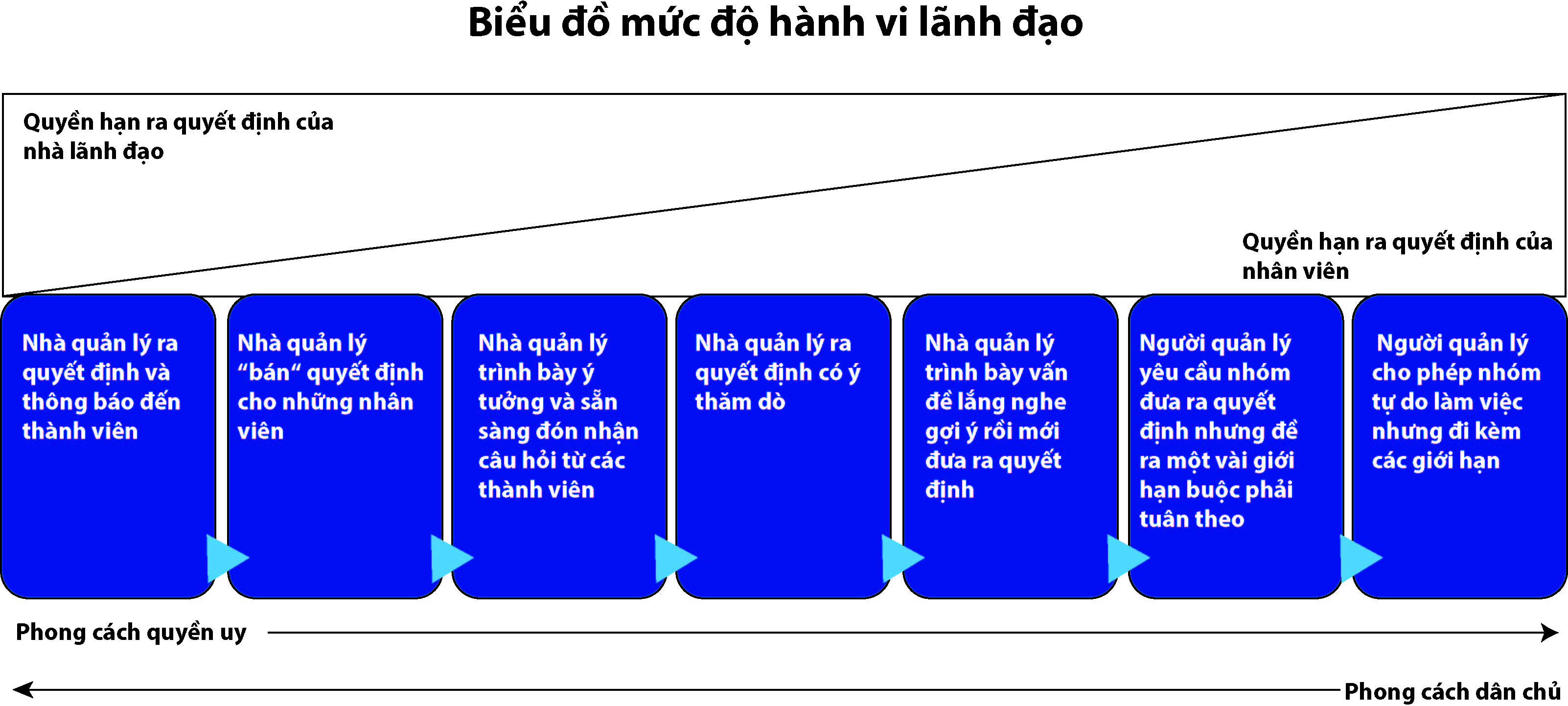 Có thể thấy nếu nhìn biểu đồ từ trái qua phải, quyền hạn ra quyết định của người lãnh đạo giảm dần trong khi đó quyền này của nhân viên tăng dần. Biểu đồ được xây dựng gồm 7 cấp độ tăng dần từ trái qua phải về quyền hạn ra quyết định của nhân viên. Căn cứ vào khả năng cũng như kinh nghiệm của các thành viên, bạn hãy chọn lựa một trong bảy cấp độ khởi điểm phù hợp, và chuyển sang cấp độ tiếp theo nếu thấy được sự tiến bộ trong nhóm của bạn.